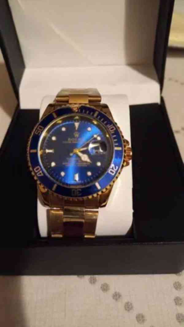 Nabízím pánské náramkové hodinky inspirované designem Rolex. Jedná se o neoriginální výrobek, který není vyráběn ani certifikován společností Rolex. Hodinky mají elegantní zlaté provedení s modrým ciferníkem a lunetou, což jim dodává výrazný a luxusní vzhled.