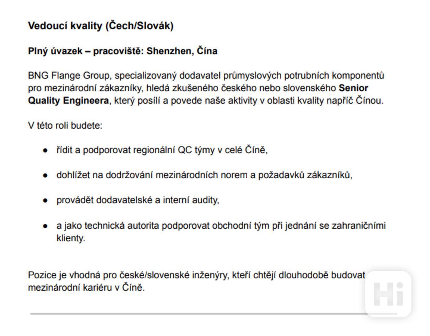 Vedoucí kvality (Čech/Slovák) v Shenzhenu